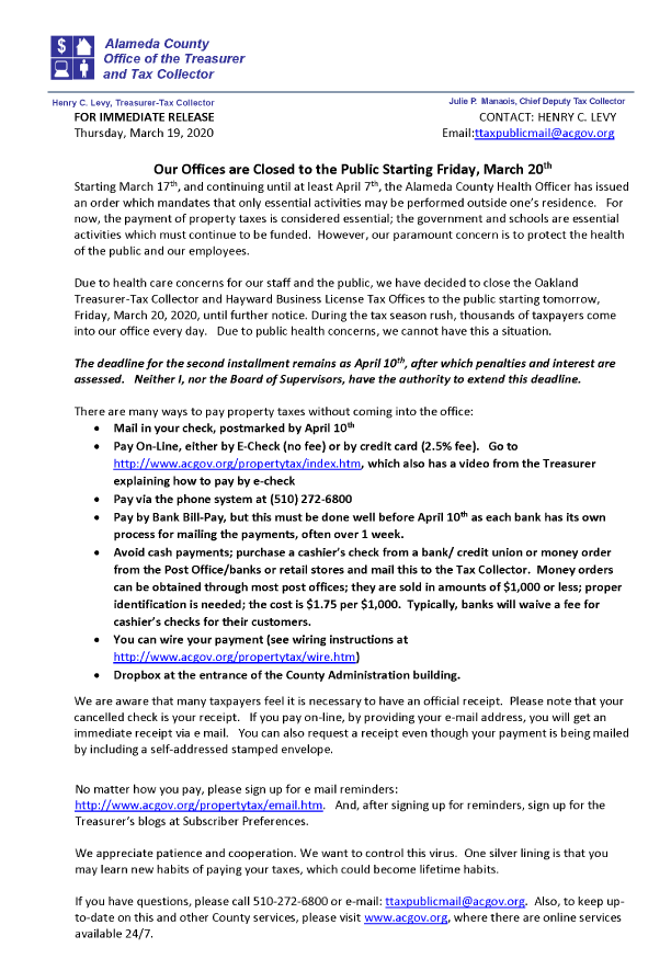 This process will remain in effect until May 4 -- the current expiration date for Alameda Countys shelter order -- and new policies will be announced in the future according. The Treasurer-Tax Collector TTC does not conduct in-person. Legal deadline for filing business personal property statements without penalty.